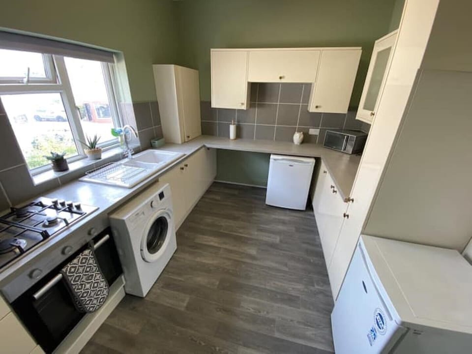 Kitchen has all facilities, microwave, kettle, toaster, cooker, washing machine, fridge, freezer.