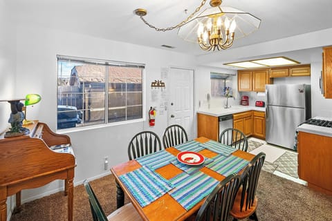The fully stocked kitchen comes with everything you need whether you're fixing a cup of coffee to sit and relax, a hearty breakfast before hitting the slopes or a homestyle family meal after a long day of Big Bear adventures. The kitchen is equipped with stainless steel appliances and an indoor dining table nearby. A propane BBQ is located in the private front patio area close to the kitchen/dining area making it convenient to grill up a delicious meal.