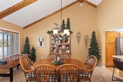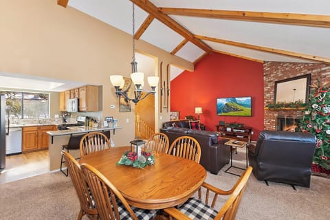 Step into Bear Mountain Tee & Ski and head upstairs where the main living area and open layout create a warm and welcoming atmosphere for your mountain retreat. Enjoy gathering in the main living area where the kitchen, dining table and living room all flow seamlessly together. The living room is adorned with a plush leather couch, sofa and reclining chair as well as a wood burning fireplace and a large smart flatscreen TV for your enjoyment. The cozy mountain charm and inviting interiors are ideal for a memorable mountain getaway.