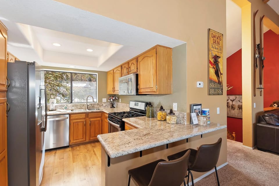 Enjoy the fully stocked kitchen, equipped with a gas oven/range, dishwasher, microwave, toaster & coffee maker for your morning brew. The kitchen is perfect for preparing a quick breakfast before your day full of alpine adventures or a nice home cooked family style meal. The solid wood dining table adjacent to the kitchen offers seating for 4, and just out the back glass door you can find a propane BBQ, an outdoor dining table and seating to enjoy an al fresco dining experience with a golf course backdrop!