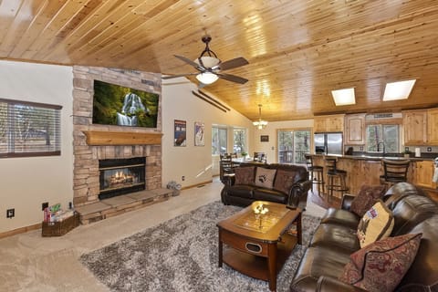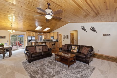 ✹ Inviting Family Room: The spacious family room features pine plank high vaulted ceilings and plush leather sofas. Cozy up by the gas pellet fireplace or unwind with the flat-screen TV featuring YouTube TV. A shuffleboard table adds an extra touch of fun for game enthusiasts.