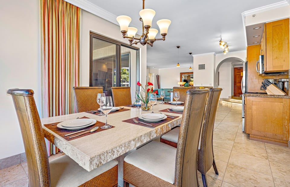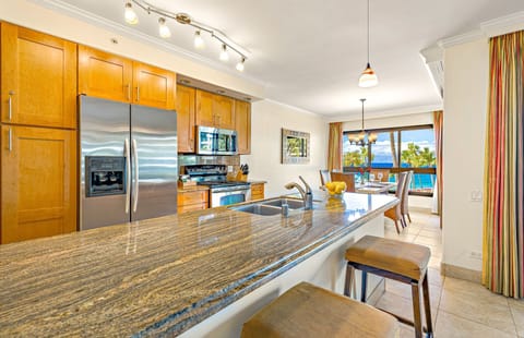 The modern kitchen is outfitted with granite counters and stainless steel appliances and has everything you need to prepare a perfect meal after another day in paradise. Dine in the air-conditioned interior or on the large private lanai featuring breathtaking ocean views.