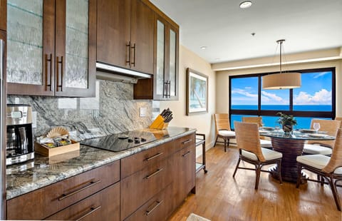 The modern chef's kitchen features a Sub-Zero fridge and high-end appliances and is fully appointed with all the necessary cookware, allowing you to create the perfect meal or refreshment. The in-suite dining area directly overlooks Kaanapali Beach and the crystal blue ocean beyond.