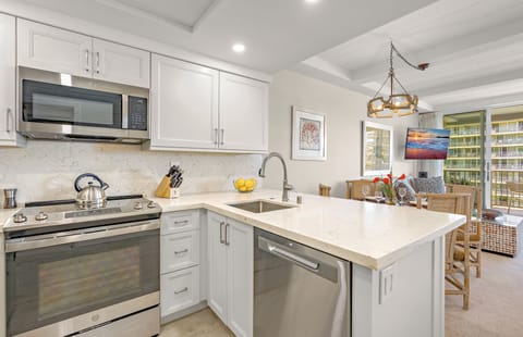The full modern kitchen has been luxuriously updated with custom cabinetry, marble countertops, and high-end stainless steel appliances, and is equipped with all the utensils and kitchenware you will need during your stay. Dine on the large private lanai overlooking the lush resort grounds and pool, or enjoy your meals at the air-conditioned, in-suite dining area.