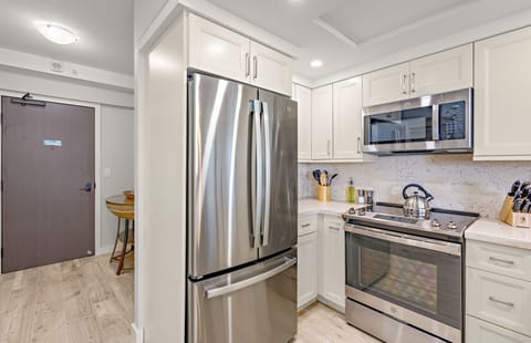 With a sumptuous king-size bed and a queen-size convertible sofa sleeper, your group can comfortably sleep up to four guests. The en-suite bathroom has been fully redone with upgraded cabinetry, marbled counters, and a tiled walk-in shower for a lavish bath experience.