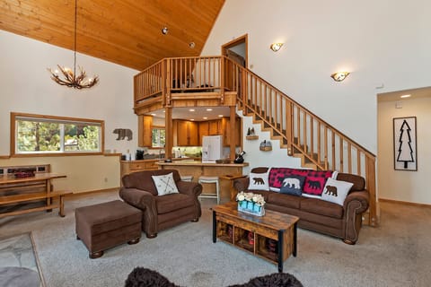Upstairs: The loft area includes a small office space, perfect for work or hobbies. The second bedroom has two twin-over-queen bunk beds, a large flat-screen TV, ample closet space, and deck access. A full-size bathroom is also located in the hall.