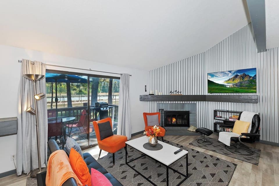 ✹ Inviting Family Room: Relax in the open, airy family room with floor-to-ceiling windows showcasing the wooded view. Enjoy a fire in the European wood-burning fireplace, watch shows on the large flat-screen TV with Netflix & Disney Plus, or lounge on the comfy seating and futon bed. Access the deck directly from this space.