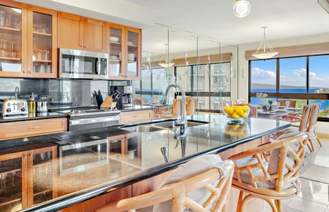 From its incredible 9th-floor vantage point high above the palms, Alii 191 delivers gorgeous unobstructed views of the Pacific Ocean that extend to Kaanapali's famous Black Rock and Maui's neighbor island Molokai, in addition to epic vistas of the lush West Maui Mountains. Its incredible ocean views can be enjoyed from nearly every room in the home, including both bedrooms, the living room, the dining area, and the kitchen.