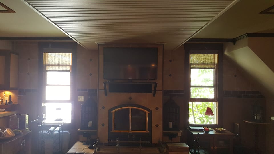 There is a wood burning fire place in the living room, a pellet stove in the sun room and a gas fire place in one of the bedrooms and yes we provide wood. Linens are provided. Cable TV.