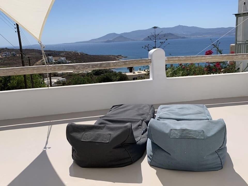Through the entire house: LAYOUT Main Entrance Level • Dining space • Fully equipped kitchen • Bathroom • Living room with built-in sofa All the above form an open plan sea view area with a comfortable sitting room and a spacious dining space for 6-8 persons. From the dining area a few stairs up take you to the second floor. Upper Level • 1 Master Bedroom with king size bed, built-in open wardrobe – dressing area, A/C, TV, direct access to the perfect cycladic balcony and sea view. • 1 Bedroom with queen size built-in bed, A/C, direct access to the unforgettable balcony and sea view. • Bathroom with shower and sea view. • Veranda with stunning sea views with a cozy sitting area and two built-in exterior sofas • Small sitting room offering an exit to the sunset garden. Hey Blue Aura Villa can comfortably host 6 people, while in the event that more than 6 people wish to stay, an extra sofa that turn into bed is available in the ground floor. We are certain that you will appreciate the discreet decoration and the design of the villa that meets all modern demands, the amenities that are located throughout the residence, the very comfortable mattresses as well as the high quality pillows and bed sheets that will ensure you have an excellent sleep!!! About this place: Beach, Remote, Relaxed, Design