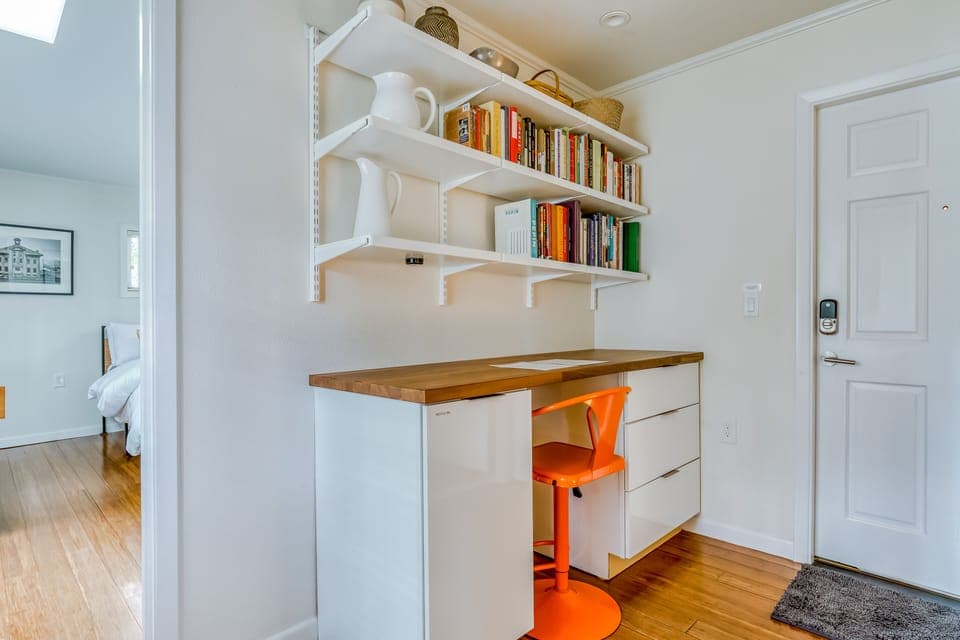Come and enjoy a lovely mid-century hideaway during your trip to the Portland area. Set in the upscale Lake Oswego suburb, this lovely home represents a stylish coming together of old and new. Relax around the living room's classic painted brick fireplace, or take the party outside to the firepit in a secluded courtyard. Board games are included for late night fun! The stylish open living room area pairs nicely with the galley-style full kitchen, appointed with tasteful full-size appliances as well as unique octagonal windows and glass blocks to bring in natural light. Four desk workspaces are all set up for guests who need to complete remote work assignments. Each bedroom is lovingly decorated with a unique look, tying together to make this mid-century modern home a truly unique retreat.