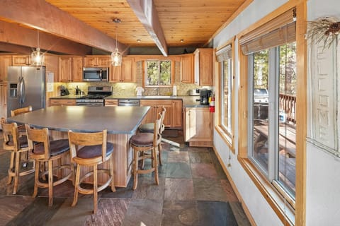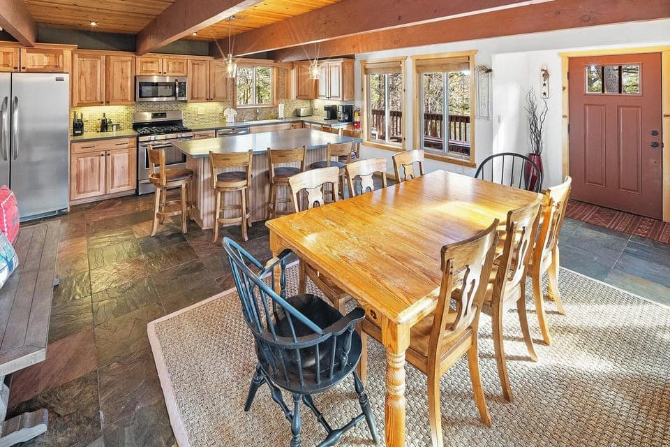 The fully stocked kitchen is perfect for creating anything from a family style dinner to a quick breakfast before you head out the door for your day of adventures. The solid wood dining table and seating for eight allows your group to gather together for meals while six barstools at the kitchen island breakfast bar offer extra seating.