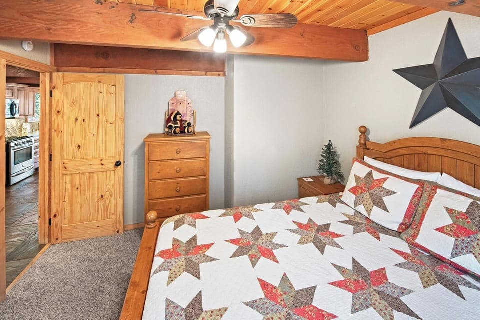 Each of the bedrooms offered at Koda Bear Lodge are thoughtfully designed to provide a comfortable and peaceful place to rest and recharge during your stay. You will conveniently find 1 bedroom and a full bathroom on the main living level where you enter the home, 2 more bedrooms plus 3/4 bathroom on the upper level and a kids bunkbed room connected to the game room on the lower level of the cabin.