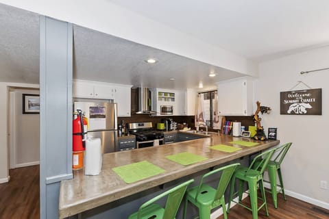 The welcoming and cozy layout of the living area at The Summit Chalet makes you feel right at home. Snuggle up on the cozy sectional couch while the wood burning fireplace keeps you warm and gives you all the nostalgic mountain vibes. Enjoy watching your favorite movies on the Smart Flat Screen TV with streaming services and simply enjoy the feeling of escaping to the mountains.
