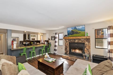 The cozy open layout allows for your group to gather together whether you are at the dining table with seating for 6, hanging out in the living area or preparing a home cooked meal in the fully stocked kitchen with a breakfast bar and 4 barstools. The kitchen setup is perfect for getting a quick breakfast before heading out the door to conquer the slopes, or creating a family style meal after a long day in the snow. The new stainless steel appliances include refrigerator/freezer, gas oven/range, microwave, dishwasher plus a Keurig Coffee Machine.