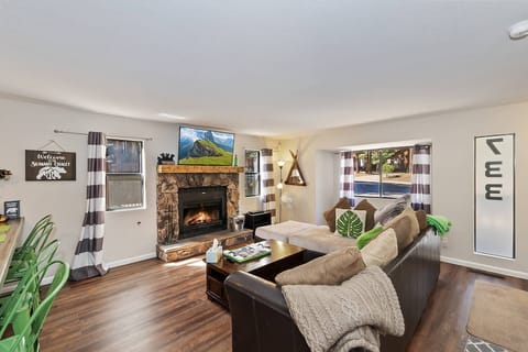 ✓ Living Room: Oversized Sectional Sofa, Cozy Wood-Burning Fireplace & Large Smart Flat Screen TV w/ Streaming Services
