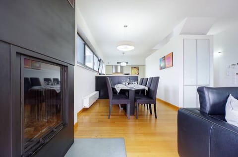 Very bright open plan area with 2 three seater leather sofas, a flat-screen TV and home cinema, comfortable wooden dining table for 8 persons and a modern kitchen with an innovative steel floor.