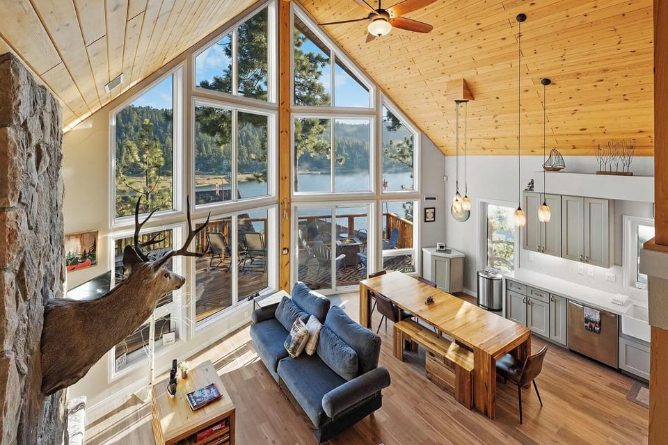 As you enter into the cabin make your way to the open living room area and experience the WOW factor of expansive high vaulted ceilings and massive floor to ceiling windows providing the most amazing view of Boulder Bay and the sparkling waters of Big Bear Lake. The centerpiece rock gas log fireplace and cozy living room furniture invite you to relax and unwind after a long day of mountain adventures while you enjoy a movie night or an exciting afternoon while watching the Big Game on the Smart Flat Screen TV.