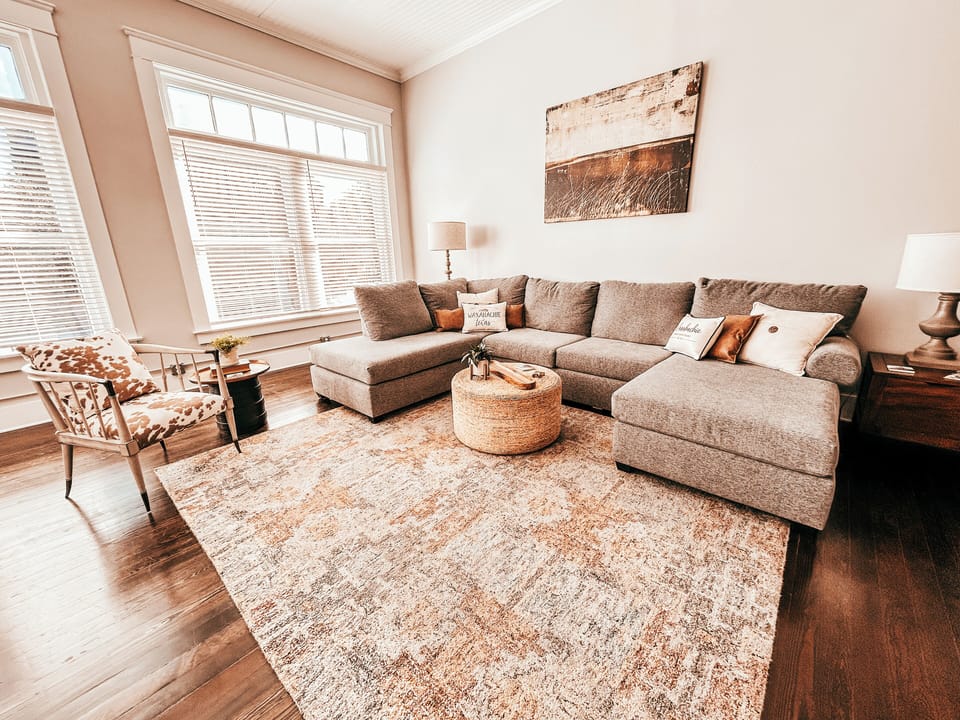 Relaxing oversized living room with views of the Historic Downtown Courthouse.