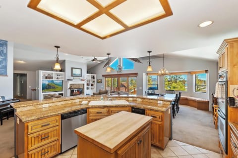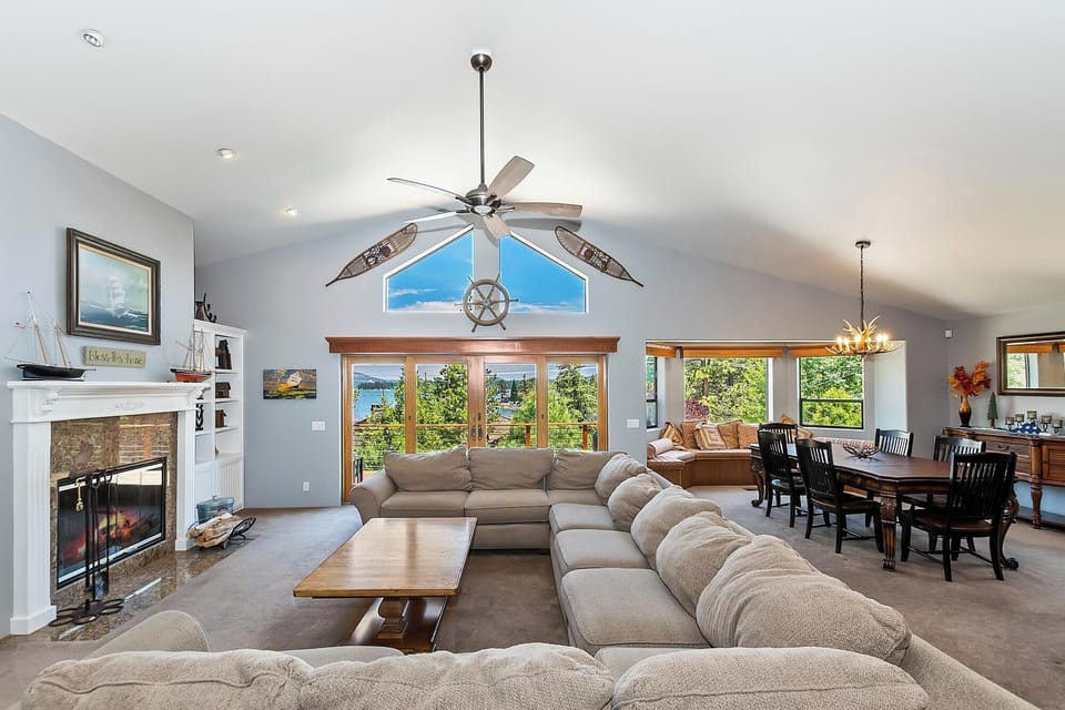 Designed with relaxation in mind, the main living area is the perfect place to gather after a day of exploring Big Bear. Tall windows frame peaceful lake views while the warm glow of the fireplace sets the scene for cozy evenings. With plenty of plush seating and a large smart TV, it's the ideal space for movie nights or lazy mornings.
