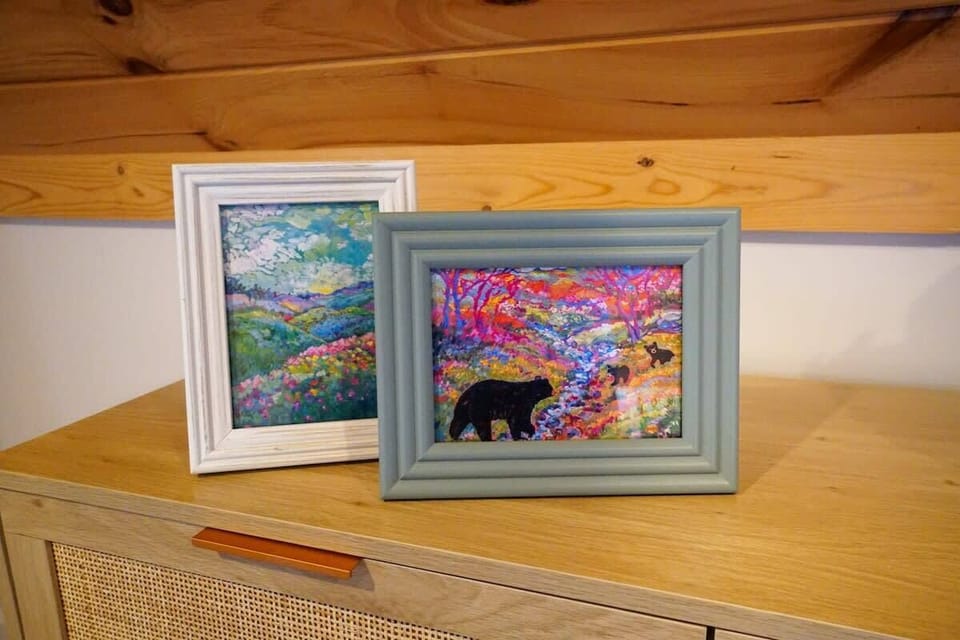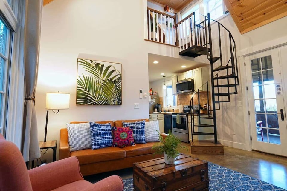 Ascend the quaint spiral staircase to the lofted open bedroom, where a queen-size bed awaits you. From here, gaze out the window to the south and spot the iconic peak of Mount Pisgah.