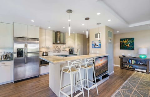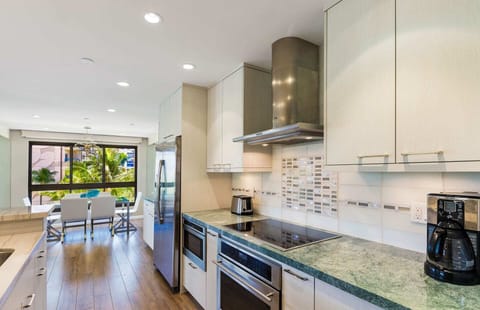 Fall into a restful sojourn in the sumptuous king-sized in the primary bedroom. Open the pocket doors to reveal the queen-sized bed nestled within the converted den. Each bedroom has an adjoining bathroom that has been fully renovated for a lavish bath experience. If needed, the pullout sofa converts into a king bed as well. The kitchen is fully appointed, allowing an opportunity for your culinary creativity to be expressed. The in-suite dining area offers views of the Pacific Ocean and world famous Kaanapali Beach to the west, along with views of the West Maui Mountains to the east.
