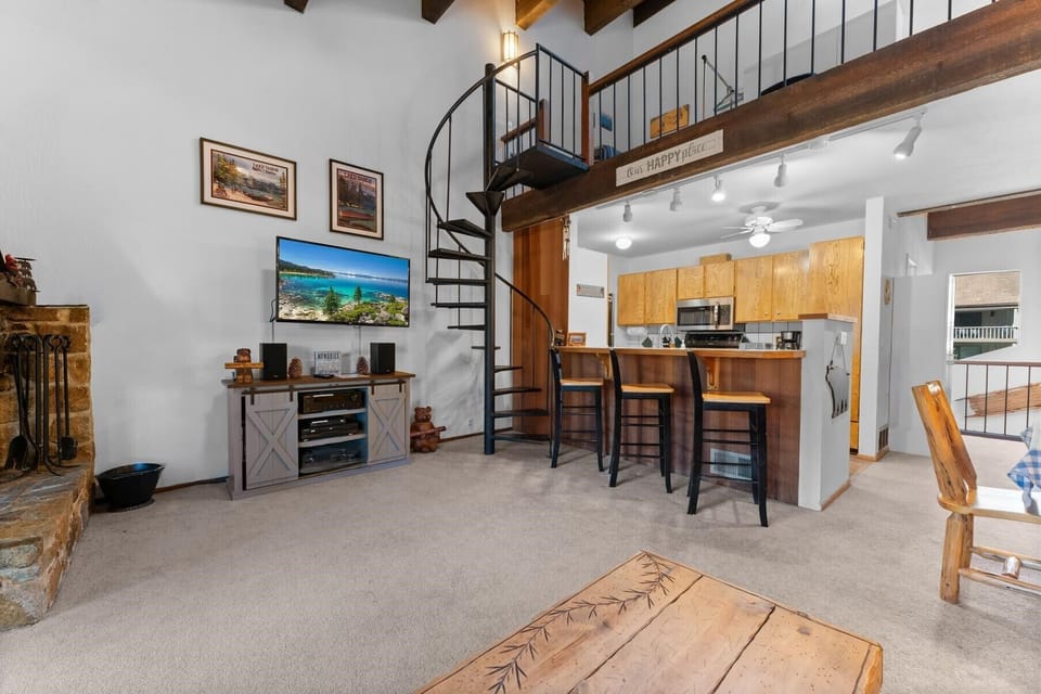 Newer upgrades throughout. Light colors with a spacious setting. The property boasts new flooring in the fully stocked kitchen including a Keurig and a stainless steel dishwasher to make life a breeze. Three bar chairs nestle under the breakfast bar providing additional dining options. The open floor plan includes a dining space for four and a living room with several entertainment options including cable TV, streaming and a nice collection of DVDs. It also features a wood-burning fireplace and a spiral staircase. Although the HOA has banned charcoal and gas grills from the complex, the patio off the living room provides an approved electric grill for safe grilling and a heavy, wood picnic table for dining.