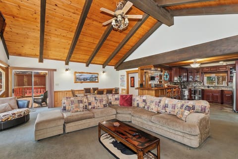 As you step through the front door, you'll find a convenient area to hang your jackets and store your outdoor gear, setting the stage for a seamless transition into cabin relaxation. Head upstairs to the main living area, where vaulted ceilings adorned with pine wood paneling, beam accents, and mountain-themed chandeliers create an inviting and modern rustic ambiance. The open floor plan features an oversized sectional couch and two plush lounge chairs, perfect for cozying up by the wood burning fireplace while you enjoy a movie night or on the smart flatscreen TV after a long day of outdoor adventures.