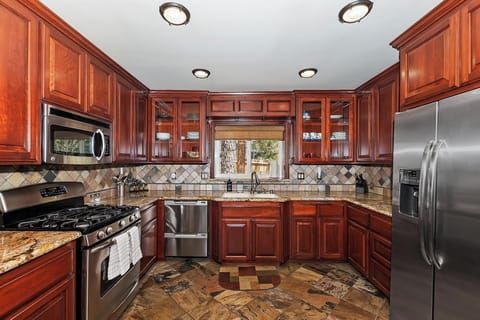 The fully stocked kitchen is perfect for making family style meals or a quick breakfast before the day's adventures. Enjoy the use of a gas oven/range, microwave, dishwasher & coffee maker. Gather around the large solid wood dining table that seats six, while your group enjoys meals and lively conversations. A breakfast bar with three bar stools offers additional seating for casual dining. Adjacent to the kitchen is a charming bar area stocked with books, DVDs, and games, ensuring entertainment for all ages.