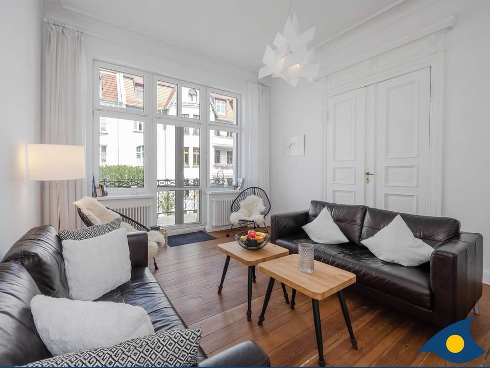 Holidays begin when the foot dangles in the sea and the heart in the sky Lovingly and harmoniously in a reduced, modern design, the 135 sqm old apartment was renovated in 2017. Now this dream home receives up to six people for wonderful Baltic holiday in urban flair with all the necessary comfort that it needs for carefree holidays. The apartment is located on the first floor and is easily accessible from the front and the courtyard entrance. �� During your stay you will have access to a powerful, free Wi-Fi. So you are always up to date or share your holiday pictures with your loved ones at home. The apartment is supplied with a flat-screen TV in the living room medial. The living room is equipped with two comfortable leather couches from Rolf Benz, in all rooms and in the hallway the old plank floors have been restored and preserved. In the kitchen is also an oiled new floorboards laid, the bathrooms are tiled, the shower areas are designed as open floor-level wellness areas. Two cuddly boxspring beds and a comfortable futon bed with comfortable mattresses ensure the restful sleep of our guests. Two tiled shower rooms one with double sink are also available. A separate kitchen with dining area for six people is equipped with a five-burner gas stove, a dishwasher, an oven and a washing machine and provide the comfortable setting for your relaxing days. A small balcony catches the morning and the evening sun and invites you to cozy moments with a view of the beautifully renovated old building lines. We wish our guests maybe with your families or in the circle of friends a pleasant and beautiful stay in the apartment Agata and a lot of fulfilled desire for holidays!