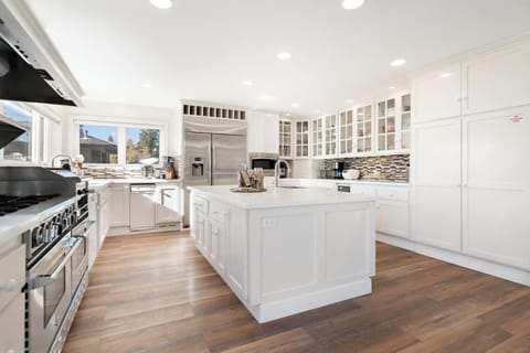 This state-of-the-art kitchen is built for culinary excellence. Outfitted with high-end stainless steel appliances, a Bluestar gas range, and stunning white countertops, it’s a dream kitchen for any home chef. Large windows above the farmhouse sink offer lake views and natural light.