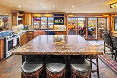 The main living area offers the perfect blend of rustic charm and upscale finishes. Gather around the wood-burning rock fireplace, unwind on plush seating, and take in breathtaking floor-to-ceiling lake views. High vaulted ceilings and natural light create a welcoming, open feel.