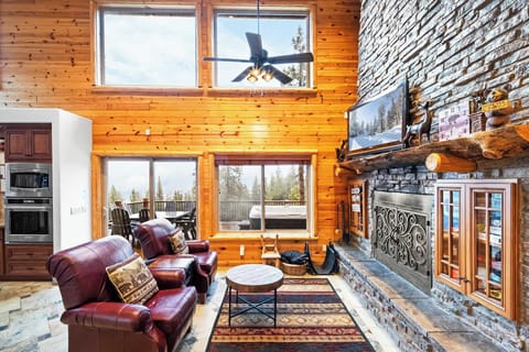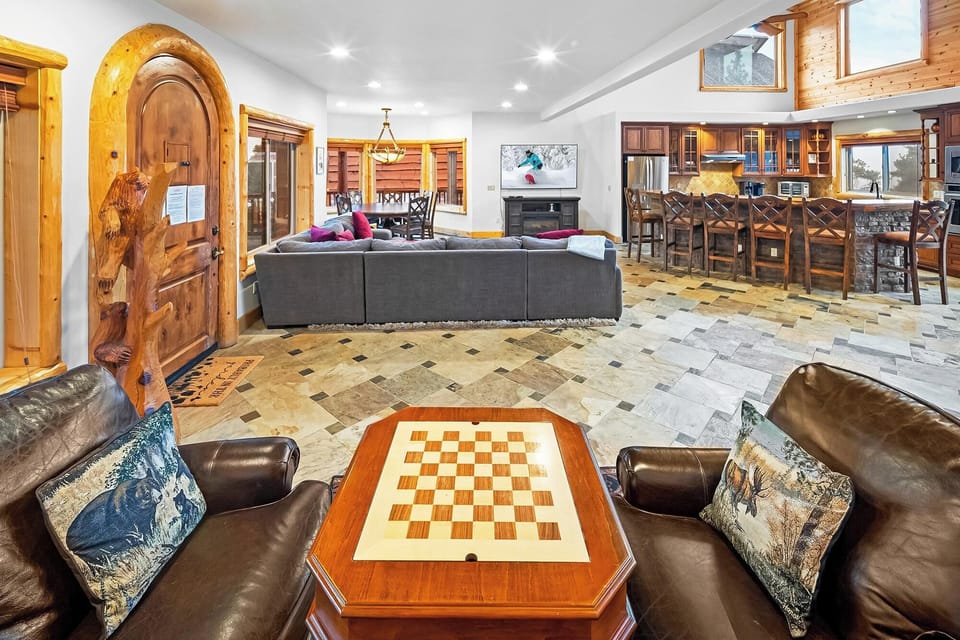 The open floor plan features a large kitchen and dining area with a center island, ideal for preparing and enjoying large family meals. The cozy sitting area by the rock fireplace is perfect for warming up or watching movies on the flat-screen TV.