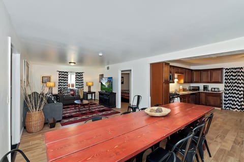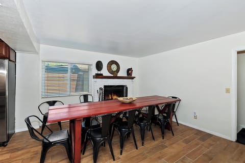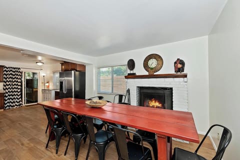 ✔Living Room: Sofa, wood-burning fireplace, flat screen TV with cable, small dining area, and foosball table