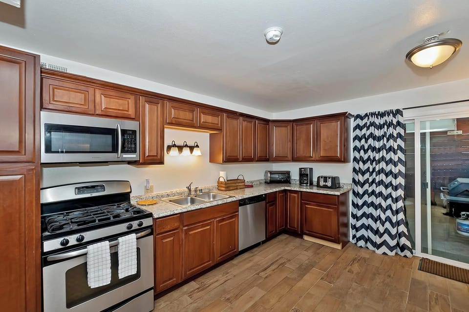 ✔Kitchen: Stainless steel appliances, gas stove, oven, microwave, coffee pot, granite counters, dining area, and backyard access