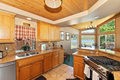The game room is packed with activities, including a pool table, Foosball, and a flat-screen TV. Step outside to relax in the hot tub with stunning lake views, or enjoy outdoor dining and lounging on the three spacious decks.