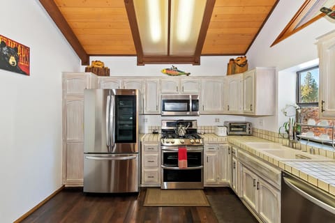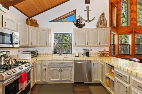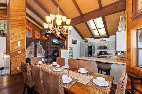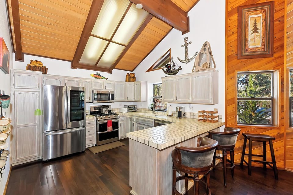Head upstairs to the expansive main living space where vaulted ceilings and an open floor plan create a welcoming atmosphere. Relax on the leather couches and enjoy the view from the mounted flatscreen TV. The open concept kitchen is equipped with modern stainless steel appliances, including a large double-door fridge, gas range, microwave, toaster oven, and Keurig. The breakfast bar seats two, while the dining table accommodates eight, perfect for family meals and gatherings.