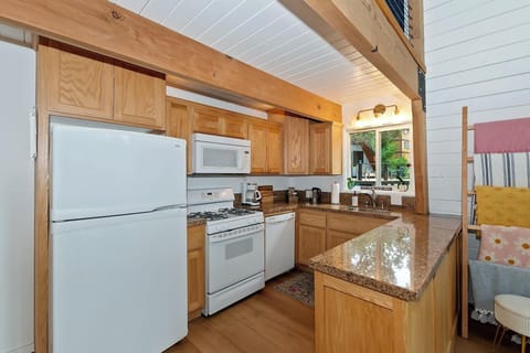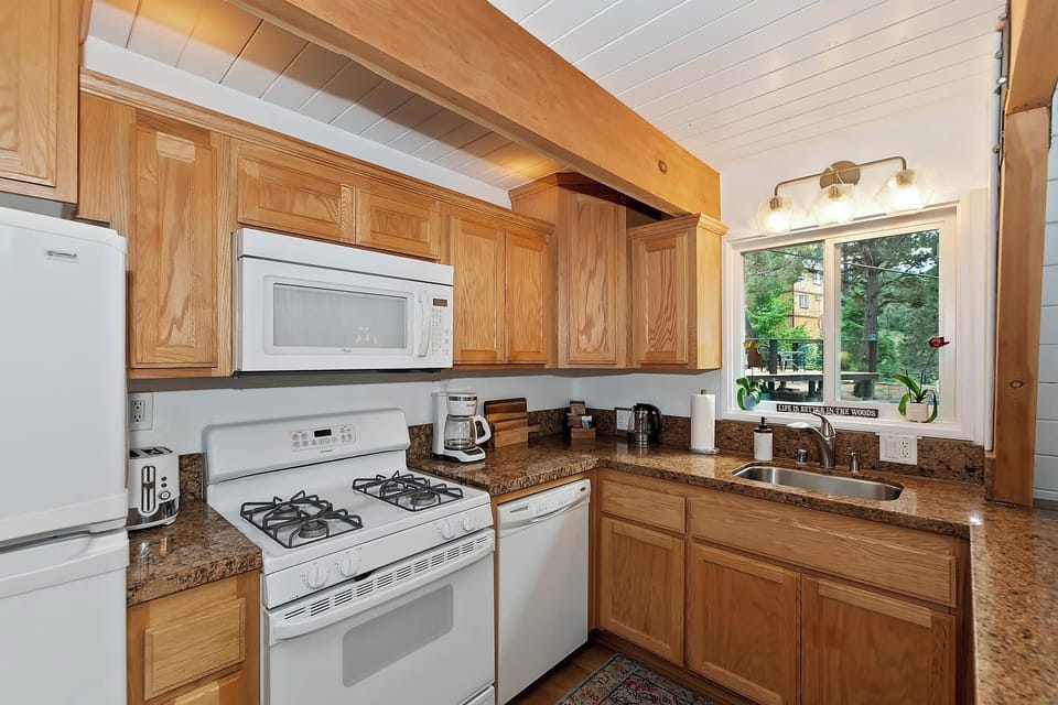 Summit View Treehouse offers a fully stocked kitchen with a gas oven/range, dishwasher, microwave, and coffee maker—everything you need to prepare a delicious meal. A modern dining table with seating for four is located just off the kitchen and living space, with a second dining table in the upstairs loft area. Both are perfect for enjoying breakfast before your mountain adventures or a fun game of cards at the end of the day.