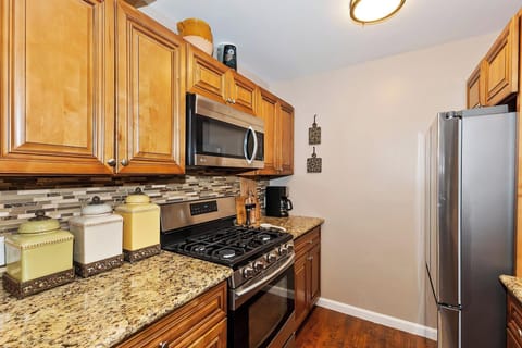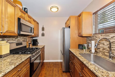✓Modern Kitchen: Equipped with stainless steel appliances, granite countertops, a gas range, oven, microwave, and fridge/freezer combo. Both a standard coffee pot and Keurig are provided. The large wooden dining table seats six and includes a high chair.