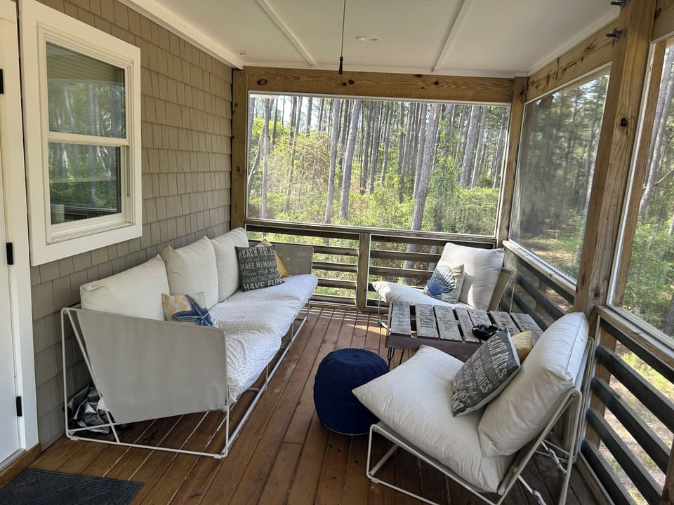 Beautiful, quiet retreat nestled in the woods just minutes from the beach. Modern appliances and well maintained house. Absolutely loved the screened in porch, it was nice to sit in and enjoy a bottle of wine in the evening, or a cup of coffee in the morning. Unfortunately hurricane Erin cut our visit short, but would definitely visit again!
