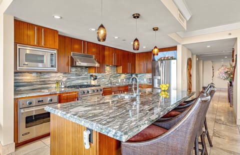 We support every meal as an experience with fully modern kitchens in each residence. The kitchens are well-equipped with stainless steel appliances, granite counters, a Vitamix blender, and all the necessary cookware. There is no corkage fee on your lanai, and the built-in professional wine cooler in the 3BR keeps your selections at the perfect temperature.