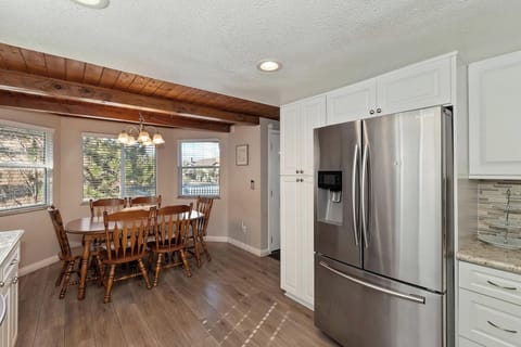 The kitchen and dining area are thoughtfully arranged to keep everyone connected during meals and conversation. Whether preparing a quick breakfast or a full family dinner, this space is fully equipped for easy mountain living.