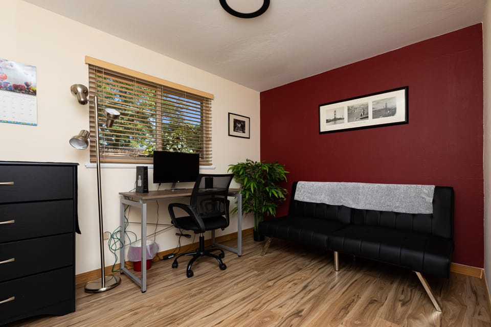 This Desert Oasis offers a comfortable stay with a welcoming deck and private backyard. It features 2 bedrooms with comfortable queen size beds and full kitchen. The home has a designated office space, including a monitor, docking station, and sofa. The dining area holds four people with an additional table in one of the living spaces for a quick meal or drinks for two. The home has 2 spacious living spaces where you can relax, read, or watch your favorite movie. There is fast Wi-Fi, a washer/dryer, and plenty of parking. A perfect home to come together yet with plenty of space to spread out. Located in a quiet residential neighborhood yet quick access to all the city has to offer.