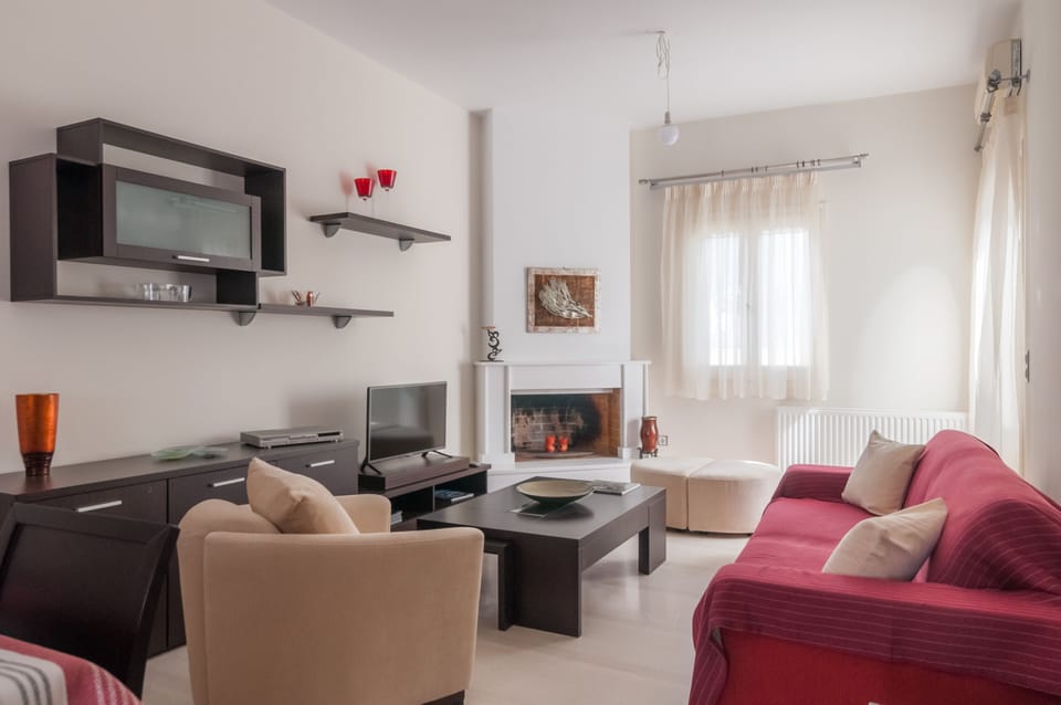 The second floor entrance leads to the living area where is a fully equipped kitchen along with a very spacious and cosy living room. Going a little further you will find a bathroom, including all amenities required, as well as a smaller WC next to the main toilet. Regarding the sleeping areas, there is a master bedroom containing a double bed and a second one with 2 single beds or double on guest's request. In the living room there is an extra sofa bed. There is also air-conditioning in both the living room and the main bedroom as well as extra blower fans. The house's design is characterized by a fluid chromatic sequence through rigorous use of materials, such as wood and the famous Naxian marble.