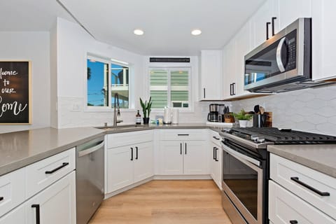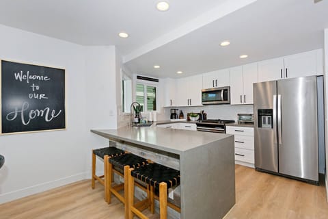 ✓ Gourmet Kitchen: Equipped with upgraded Whirlpool stainless steel appliances, including a fridge/freezer, gas range/oven, dishwasher, microwave, and standard coffee maker. The kitchen flows seamlessly into the dining area with seating for the entire group, plus additional breakfast bar seating.
