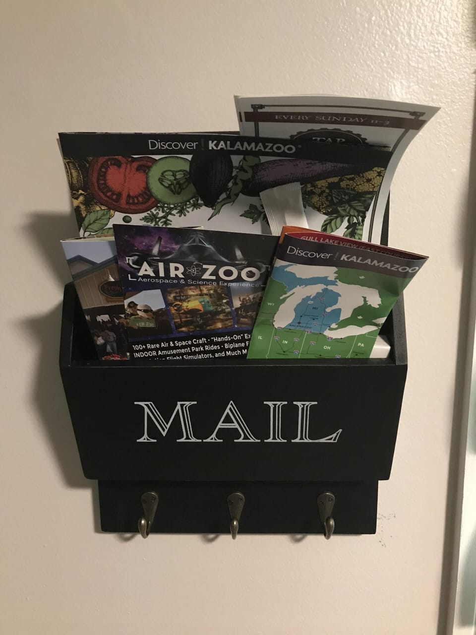 There is a mailbox in the kitchen that has menus from various local restaurants.
