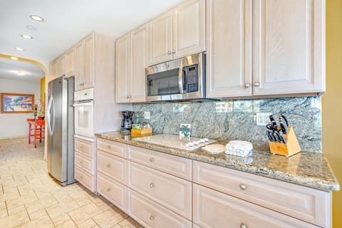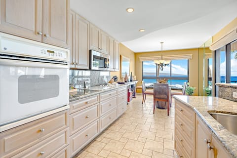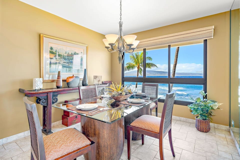 The modern chef's kitchen is fully equipped with all the necessary cookware, allowing you to create the perfect meal or refreshment. The in-suite dining area directly overlooks Kaanapali Beach and the crystal blue ocean beyond.