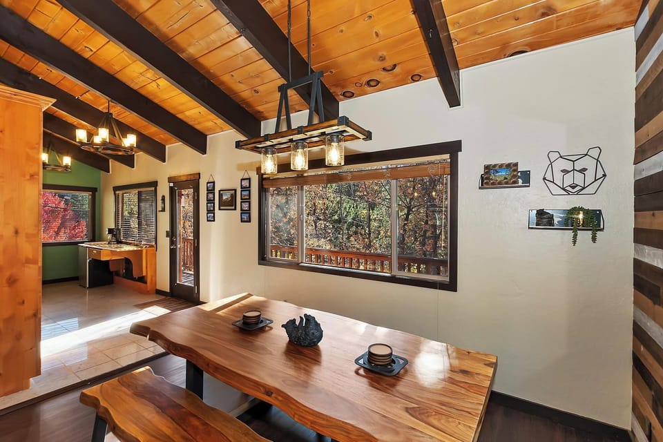 Step into a bright, open living space where contemporary design meets mountain coziness. Whether you’re curling up by the fire, streaming a movie, or simply enjoying the mountain views through large windows, Big Bear Escape is the perfect setting for memorable moments with your group.