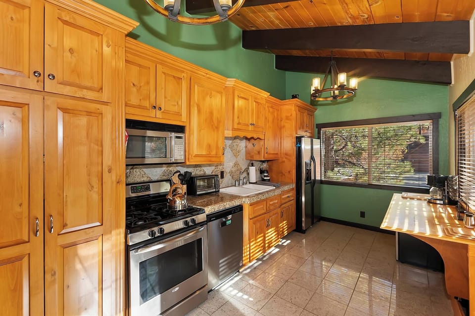 The galley-style kitchen offers everything you need to prepare delicious meals, morning coffee, or après-ski snacks. Gather around the solid wood dining table for dinner, games, or conversation.
