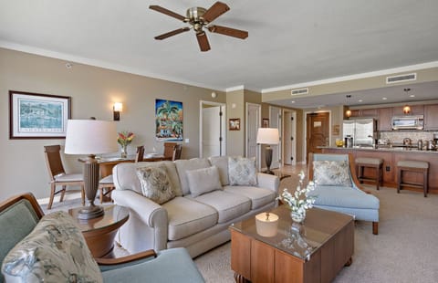 Konea 302 is one of the largest three-bedroom oceanfront suites available on the property, boasting unparalleled views of the blue Pacific Ocean, a massive wraparound lanai with a private Viking BBQ grill, and a spacious modern interior.